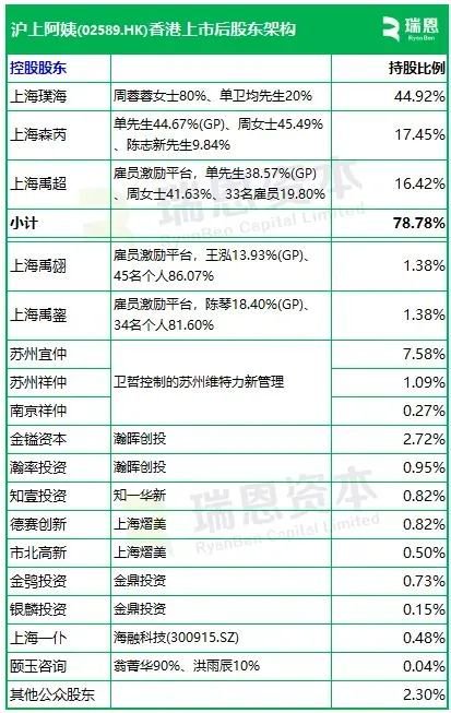 招股书显示,沪上阿姨在上市后的股东架构中,控股股东单卫均先生、周蓉蓉女士夫妇,合共控制约78.78%的投票权。