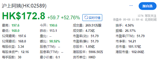 截至午间收市,沪上阿姨每股报172.8港元,大涨52.76%,总市值约181.17亿港元。